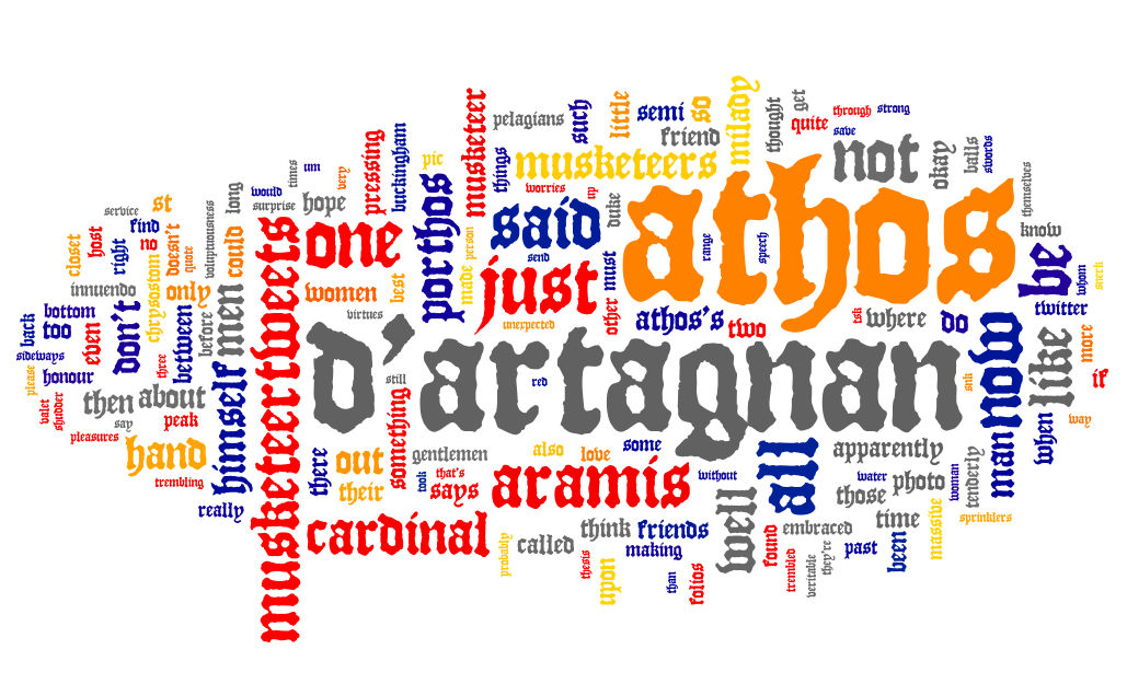 All is not lost, though: I was able to use my collection of tweets to do some basic word frequency analysis by using some simple free tools. Bear in mind this is the frequency of the words in my collection of commentary tweets rather than that in the novel itself. So basically it’s a rather egocentric mind map of the bits of the novel that made the biggest impression on me personally. Fortunately Wordle lets you make word frequencies into graphics. (I’ve ignored some common words like ‘it’, ‘he’, ‘and’, etc. for those digital methods fans out there. [Edit: And this morning I noticed that I’d done silly things like excluding ‘is’ but not ‘be.’ This is what comes of a hastily assembled data set. Consider this a musketeery lesson in data quality.]) ‘Infographic’ might be stretching it just a little in this case, as they only information you’re getting is the inner workings of my brain, but they were fun to assemble nonetheless.